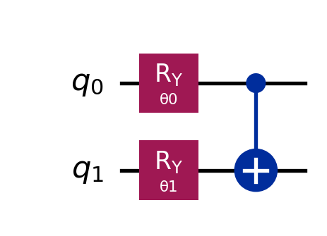 import numpy as npfrom qiskit import QuantumCircuitfrom qiskit.circuit import Parameterfrom qiskit.quantum_info import SparsePauliOpfrom qiskit.primitives import StatevectorEstimatorfrom scipy.optimize import minimize# Re-defining the Hamiltonian from the previous posthamiltonian = SparsePauliOp.from_list([("ZZ", 0.5), ("XX", 0.2)])estimator = StatevectorEstimator()# 1. Define Parameterstheta_0 = Parameter('θ0')theta_1 = Parameter('θ1')# 2. Build the Entangled Ansatz# RY rotations followed by a CNOT entanglerqc_entangled = QuantumCircuit(2)qc_entangled.ry(theta_0, 0)qc_entangled.ry(theta_1, 1)qc_entangled.cx(0, 1) # <--- The magic ingredientprint("Entangled Ansatz:")display(qc_entangled.draw("mpl"))